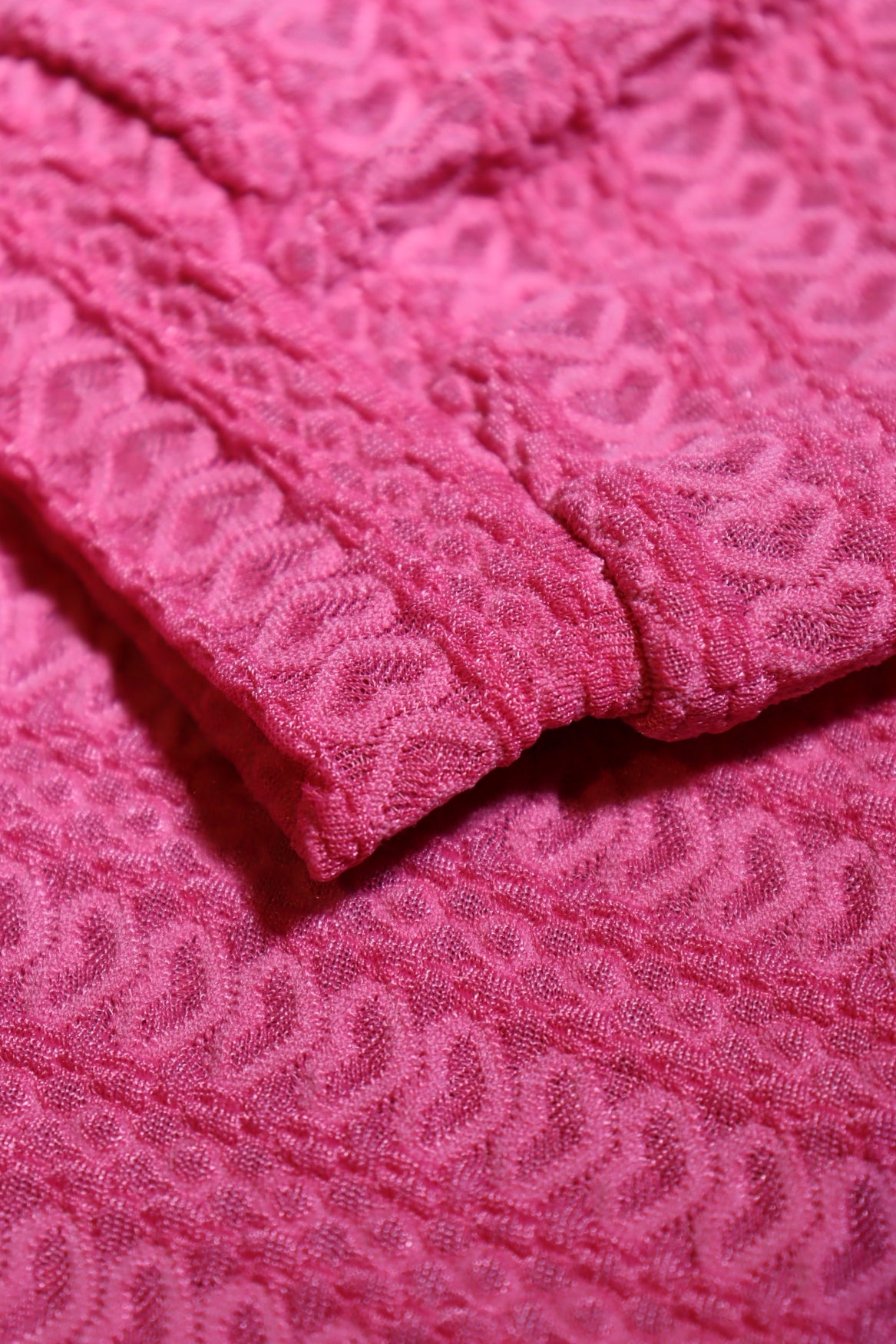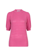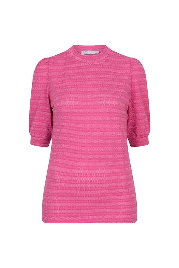 Top Stephany is een aangesloten roze top met een patroon in de stof, een hoge ronde hals en mouwen tot aan de elleboog. De top bevat veel stretch.