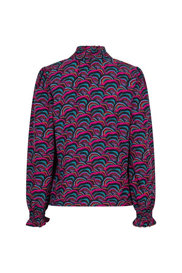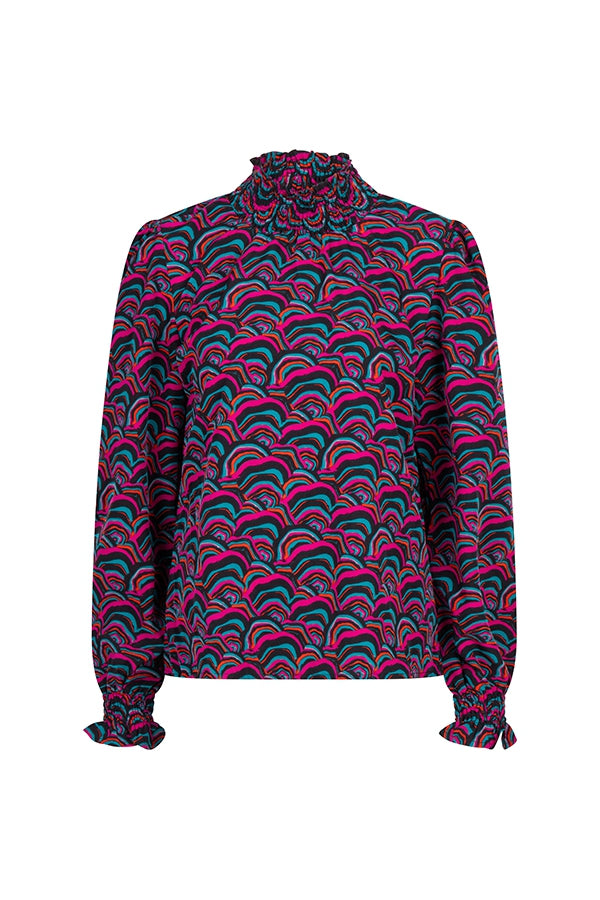 Blouse Maleah is een kleurrijke blouse met een hoge smockkraag, subtiele pofmouwen en smockstructuur en ruffles bij de mouwuiteinden. De blouse heeft een rechtvallende pasvorm.