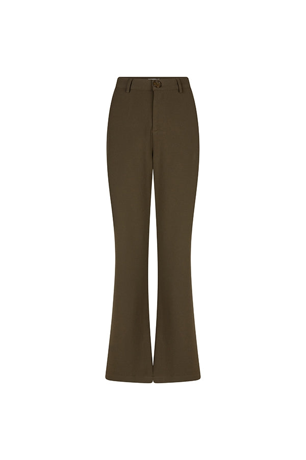 Broek Whitley is een groene aangesloten broek met flared broekspijpen. Bij de pijpen zit aan de onderkant een kleine split aan de buitenkant. De flared broek heeft een knoopsluiting, een rits in het midden en bevat veel stretch.