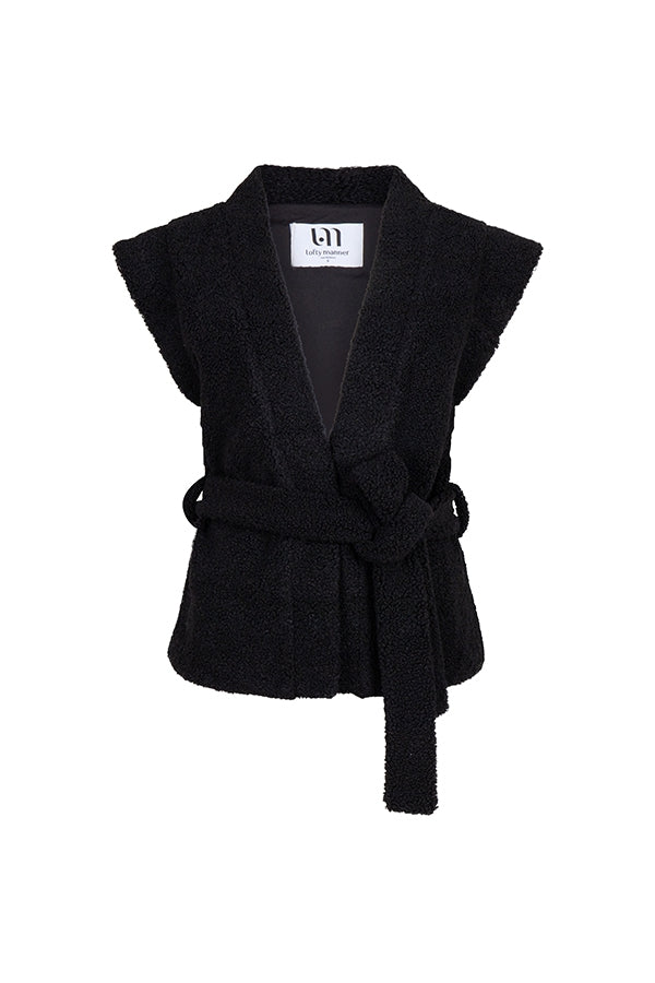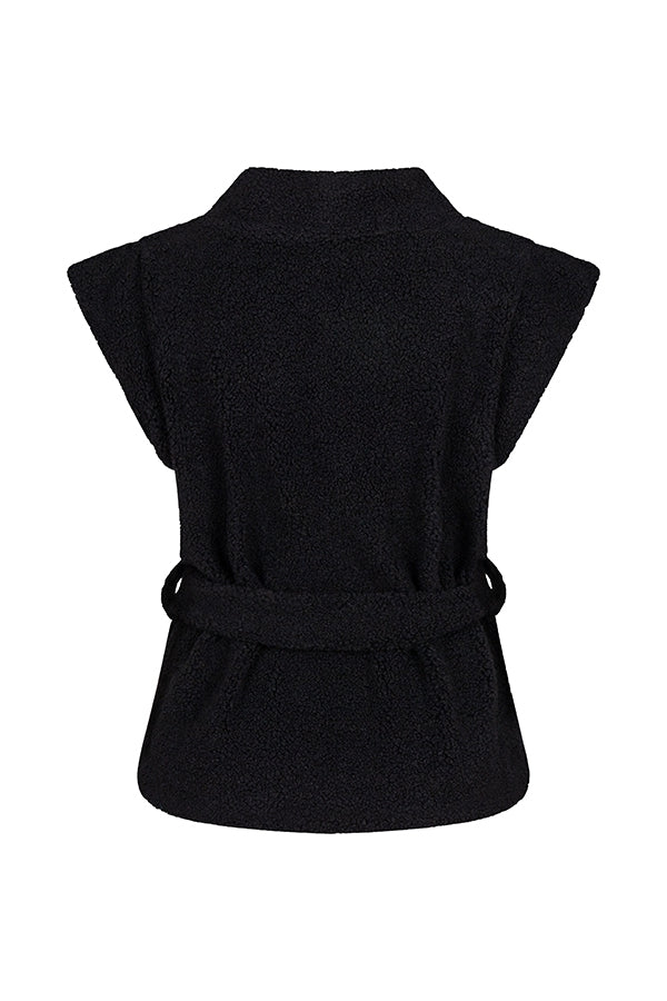 Gilet Shannon is een trendy zwart gilet van teddy stof met een losvallende pasvorm en kapmouwtjes. Het gilet heeft riemlussen en een afneembare riem.