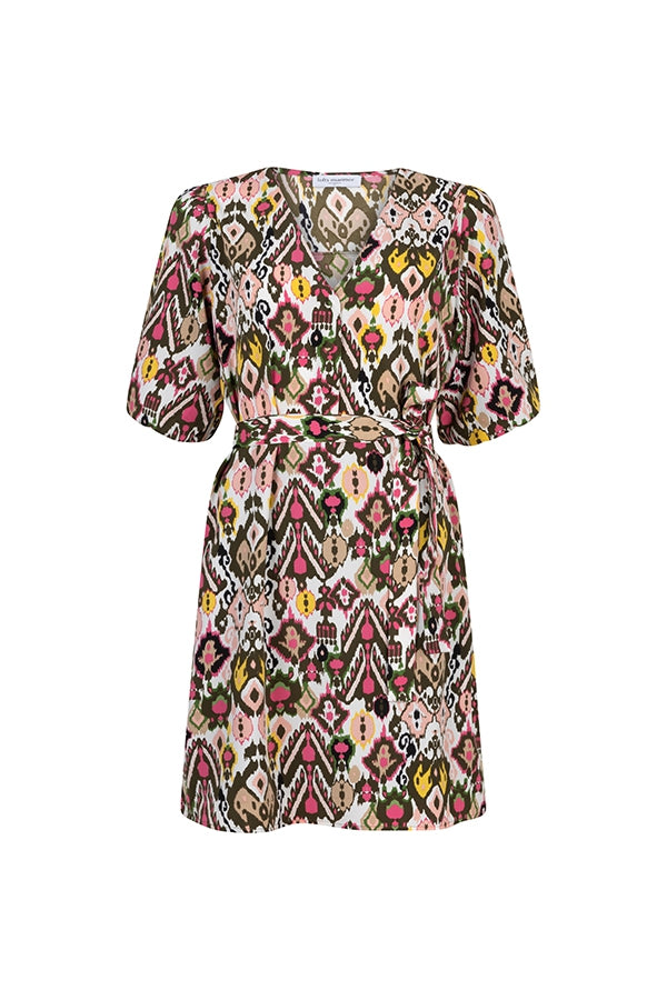 Jurk Carley is een gekleurde jurk met een V-hals en knoopjes tot aan de taille. De jurk heeft pofmouwen die tot boven de elleboog. De mouwen hebben een elastiek in de uiteinden. De jurk heeft een afneembare riem.