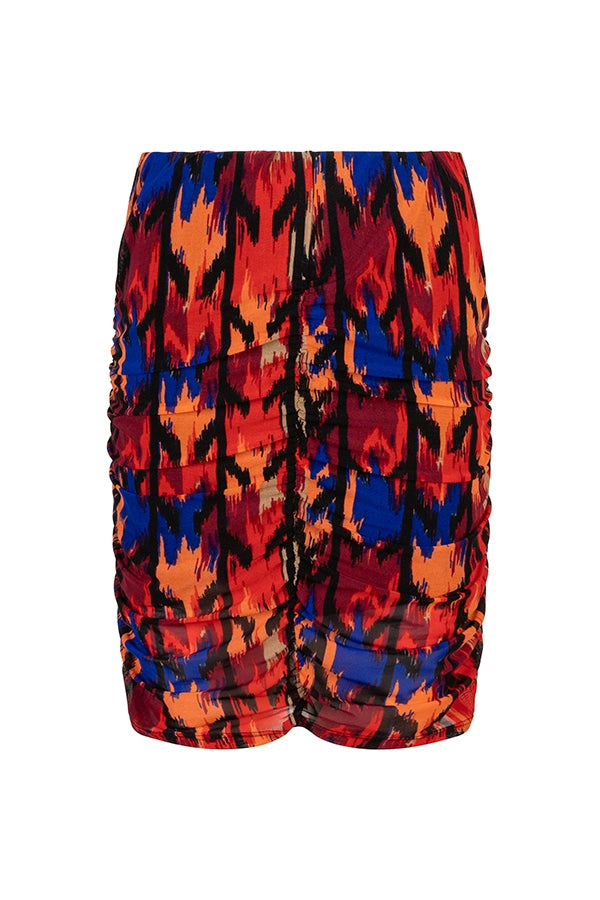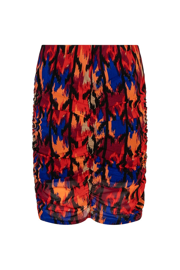 Rok Rosalina is een korte rok met aangesloten pasvorm. De gekleurde rok heeft plooien aan zowel de voor- als achterkant. De rok is see through maar gevoerd met een zwarte onderrok.