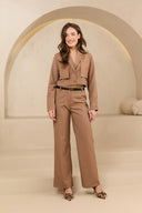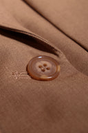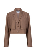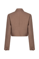 The Donja Blazer is a beige cropped blazer with a linen look. The beige jacket features monogram artwork, a lapel collar, and shoulder pads. It also has a straight fit and a two-button closure.
