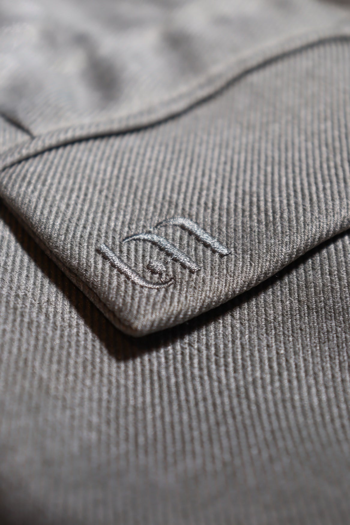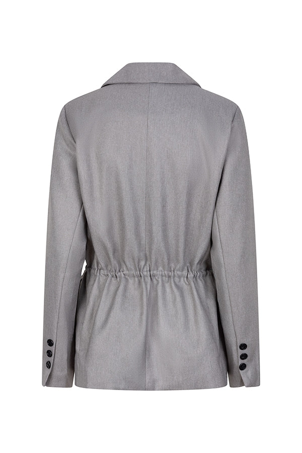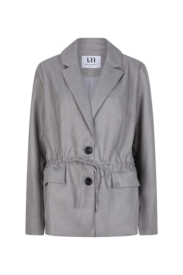 The Melinda blazer is a long gray blazer. It features a drawstring waist for adjustment. The blazer has a lapel collar, flap pockets on the front, and a straight fit.