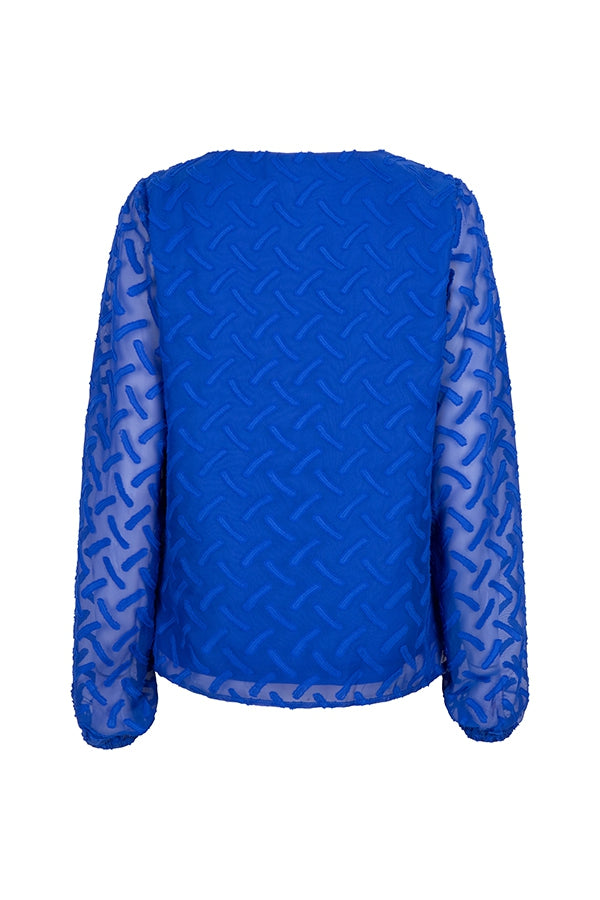 Blouse Gigi is a straight blue blouse with a V-neck and elegant puff sleeves. The sleeve ends are finished with elastic and the blouse contains a work in the fabric.