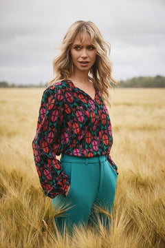 Blouse Nancy is een zwarte blouse met een V-hals, een knoopje bij de mouwuiteinden en een rechtvallende pasvorm.
