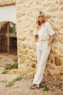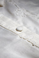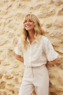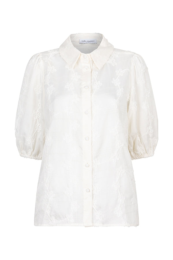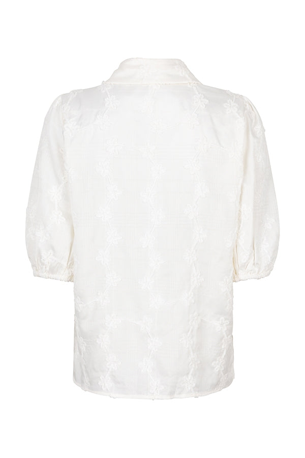 Blouse Noemi is a white blouse with embroidered floral pattern. The chic blouse has a classic collar, buttons over the entire length and three-quarter puff sleeves. The blouse is straight in fit.
