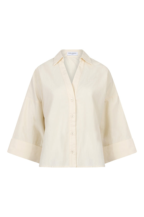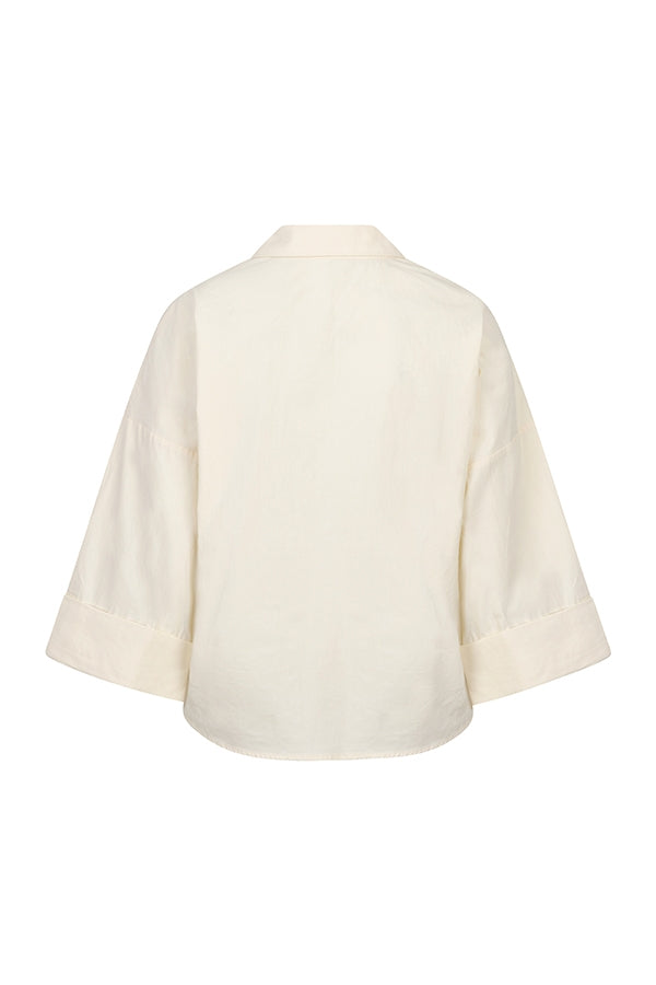 The Selou blouse is an ecru blouse with a classic collar and long sleeves. The oversized fit creates a relaxed look and drapes loosely around the body.