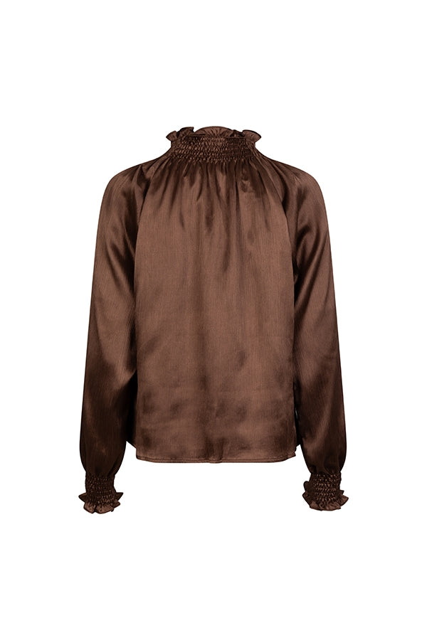 The Tyra blouse is a brown blouse with a satin look. This V-neck blouse features smocking and ruffles at both the collar and sleeves, as well as ties for tying. The brown blouse has a loose fit.