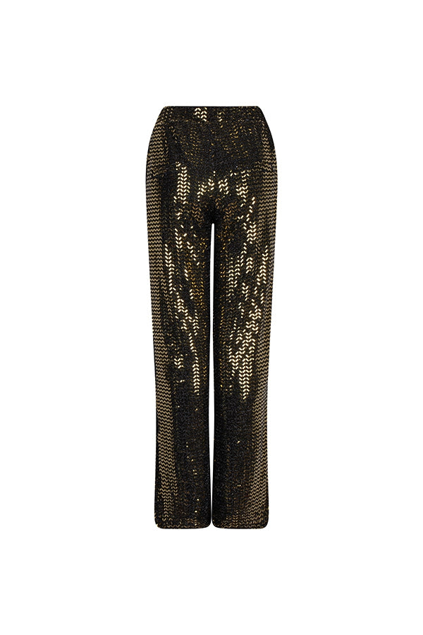 Trousers Chella are straight leg trousers with elastic in the waist. The golden trousers are made of a stretchy fabric and are decorated with sequins. Wear the trousers as a co-ord set with top Harley.