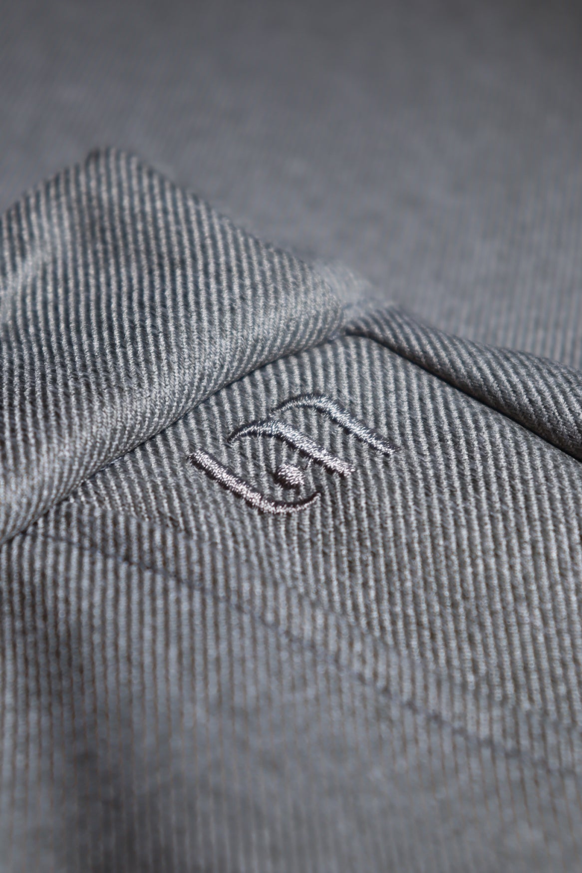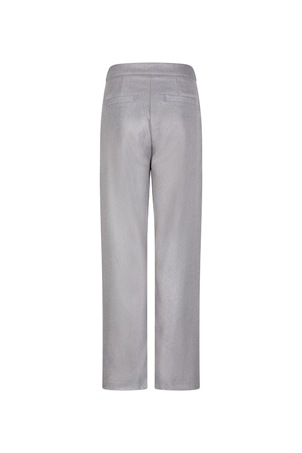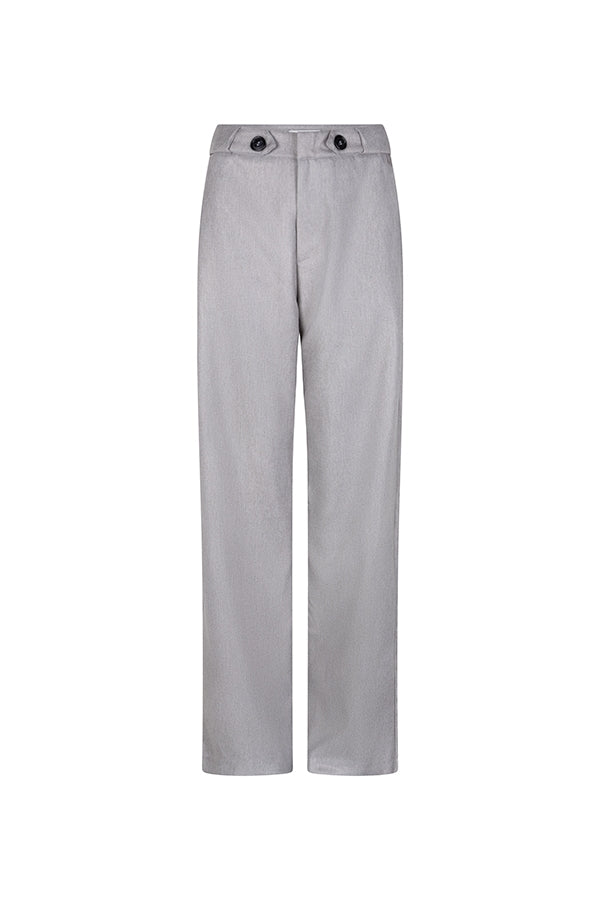 The Jazmin trousers are gray pants with a button detail on the waistband. They have side slit pockets and decorative pockets at the back. They also have a hook and eye closure and a zipper, and a straight fit.