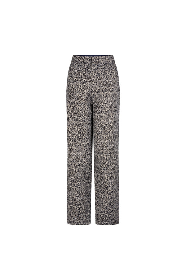 The Josephine trousers are a straight-fitting, printed design. They feature both side and welt pockets, hook-and-eye closures, and zip closures. They are made of a beautiful patterned jacquard fabric.