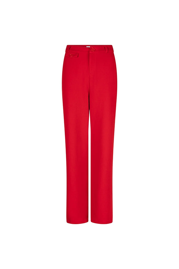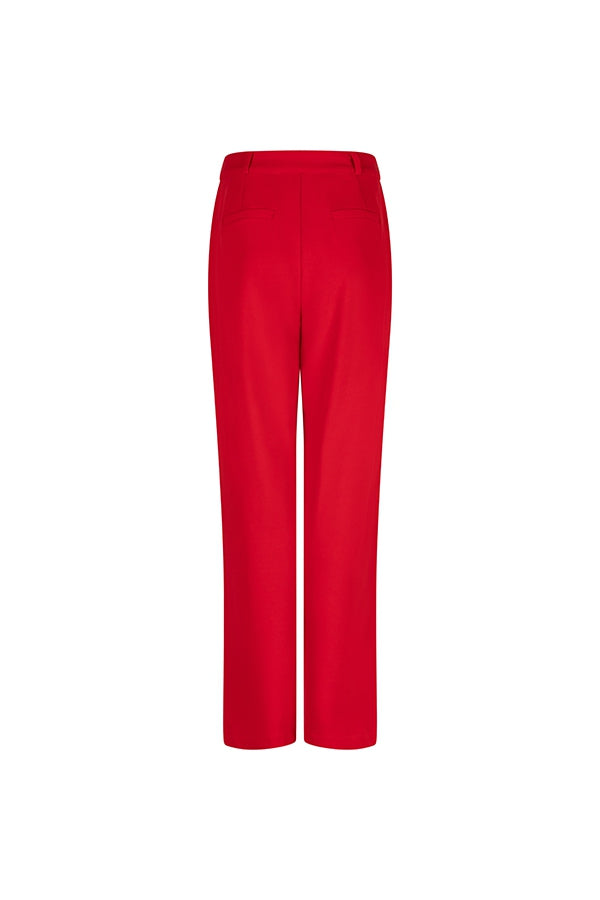 Trousers Nathalia are red straight trousers with slit pockets on the front and fake pockets on the back. Furthermore, the trousers have belt loops, a detachable belt and are made of a fine stretch fabric.
