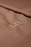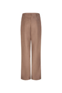 The Shayma trousers are beige with a linen look. They feature belt loops, side pockets, and decorative pockets at the back. They have a hook-and-eye closure and a concealed zipper. The trousers have a straight fit.