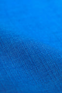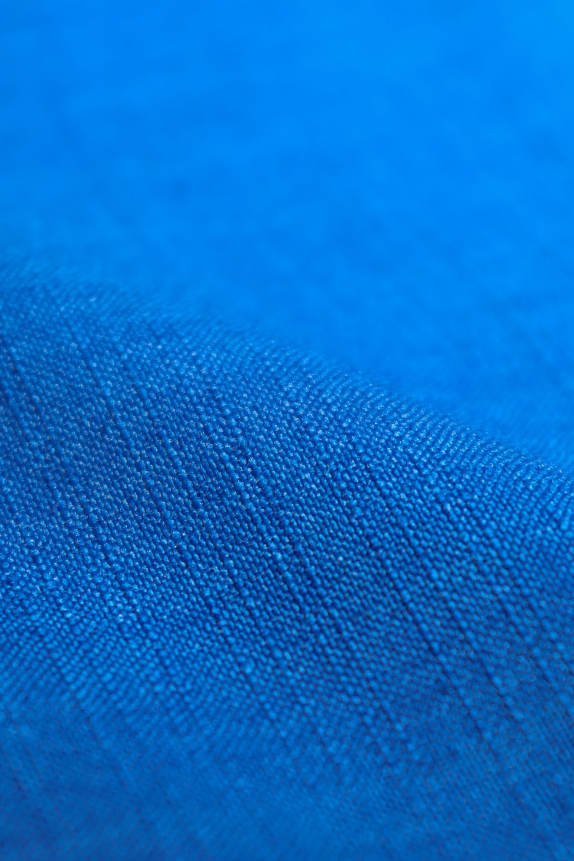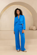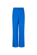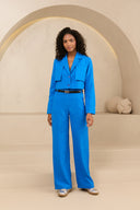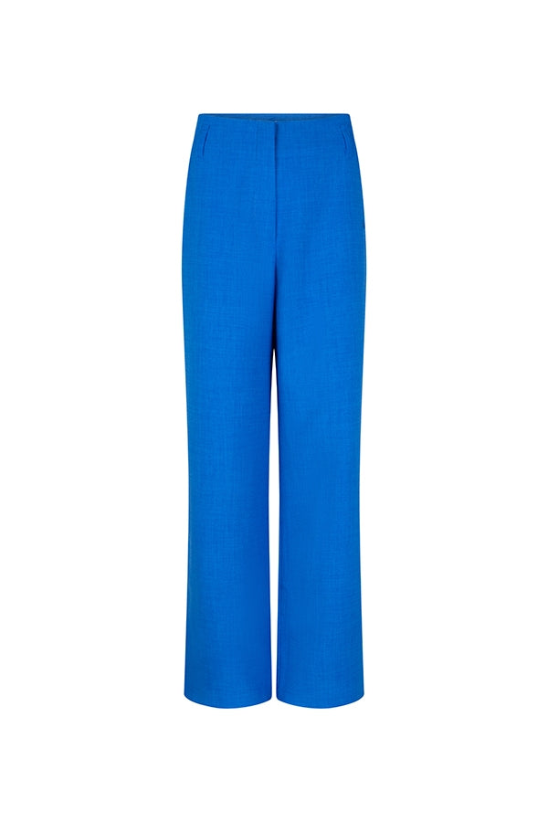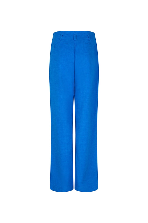 The Shayma trousers are blue trousers with a linen look. They feature belt loops, side pockets, and decorative pockets at the back. They have a hook-and-eye closure and a concealed zipper. The trousers have a straight fit.