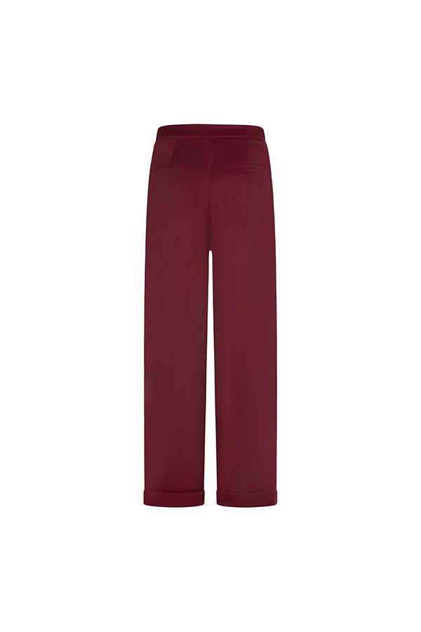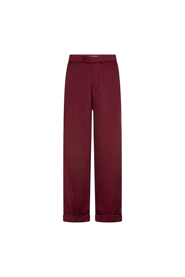 The Svea trousers are burgundy trousers with a satin finish. They feature cuffed legs, both side and welt pockets, and a hook-and-eye closure and zip closure. The red trousers have a straight fit.