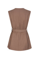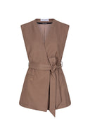 Gilet Aalya is a beige vest with a linen look. It features a detachable belt at the waist and decorative pockets. The sleeveless jacket has a fitted fit.
