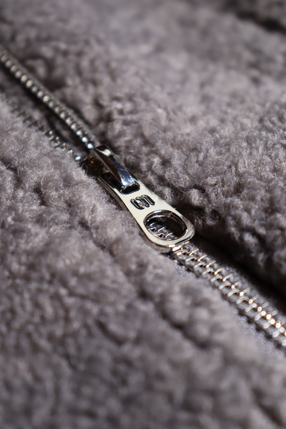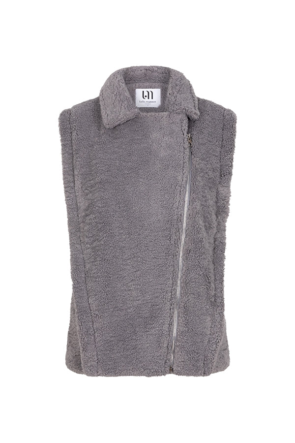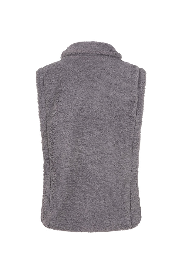 The Aliza vest is a fluffy gray vest made of teddy fabric. This gray vest features a slanted zipper, side pockets, and a lapel collar. The teddy vest has a straight fit.