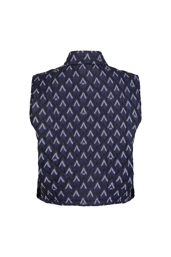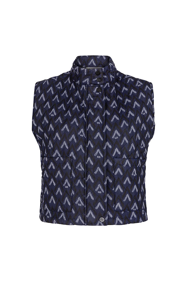 The Harper Gilet is a quilted vest with a zigzag print. This blue vest features a stand-up collar, side pockets, and a concealed button closure. The sleeveless jacket has a straight fit.