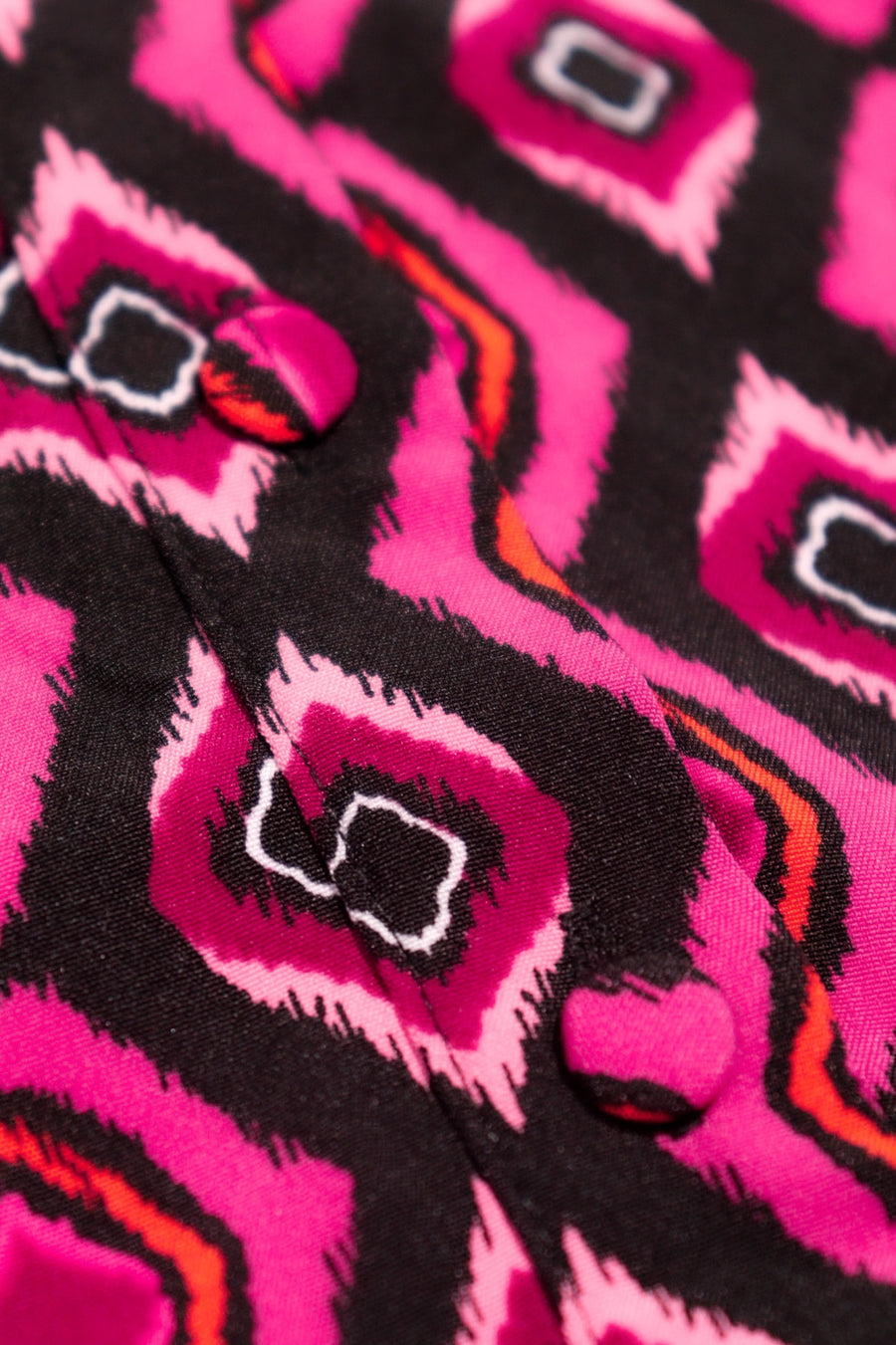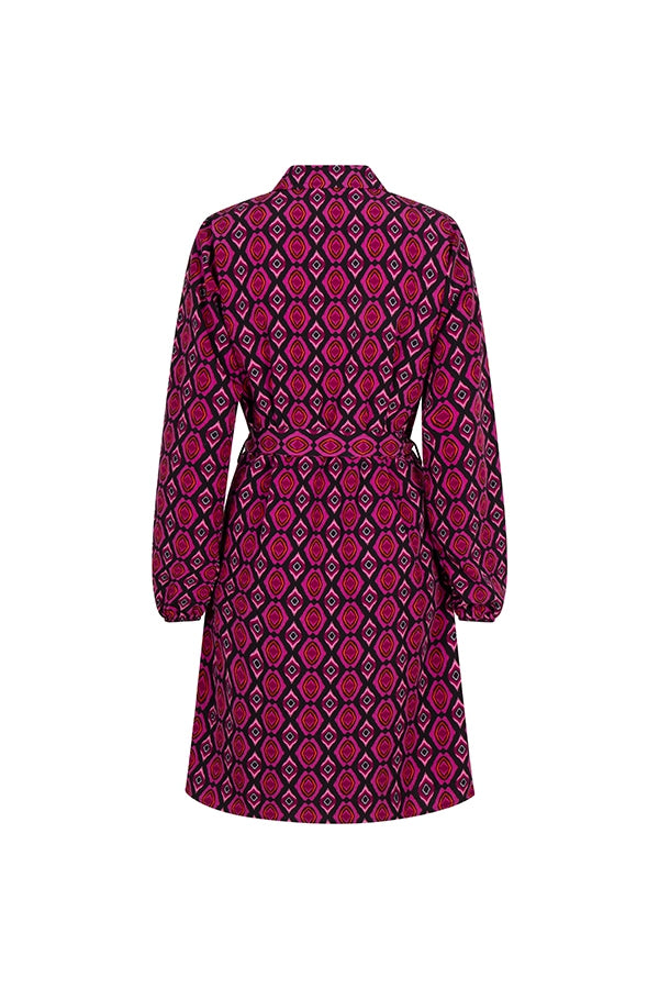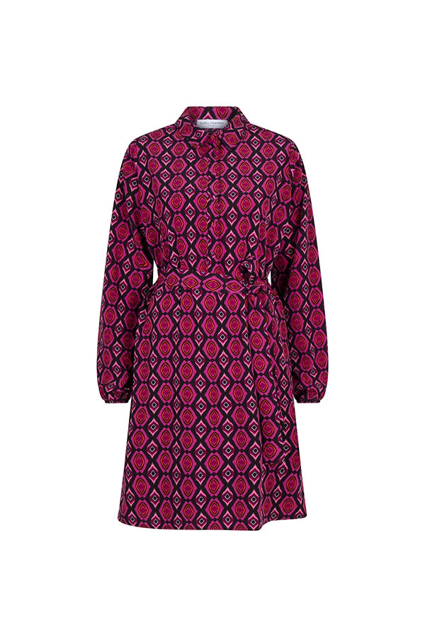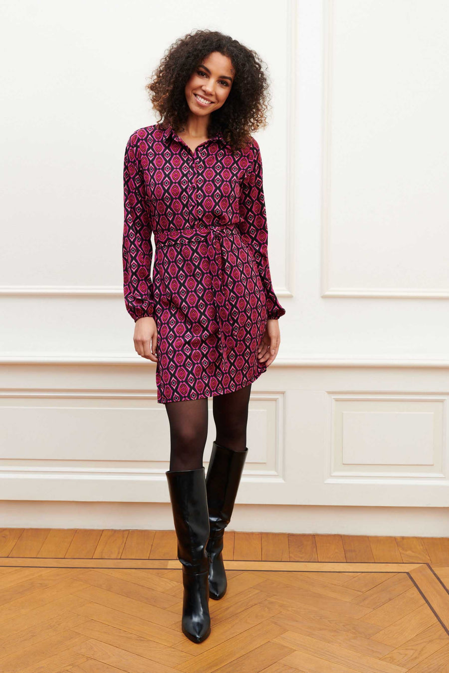 Jurk Belle is een kleurrijke jurk met een klassieke kraag, knopen tot aan de taille en elastische mouwuiteinden. De jurk heeft een afneembare riem en is qua fit rechtvallend.