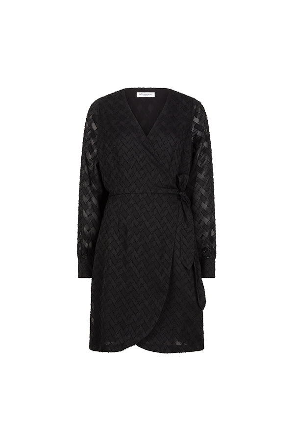 The Indy dress is a black wrap dress. This little black dress features a tie detail on the left side and is made of a beautiful woven fabric with an openwork design. The black dress has a straight fit.