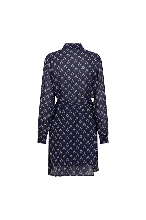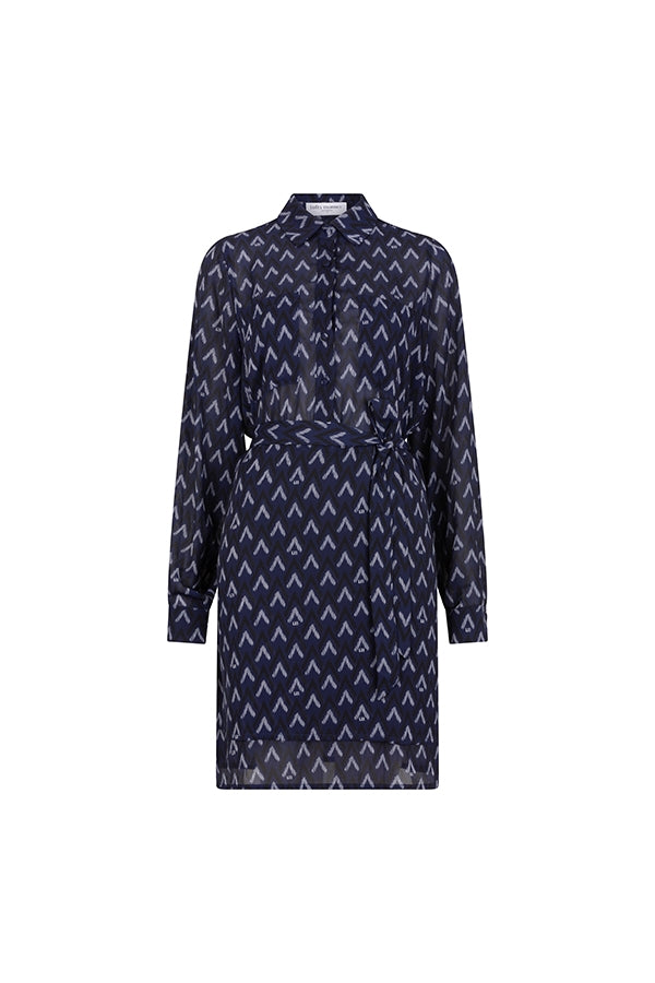The Jazzy dress is a blue, printed dress. It features a classic collar, a removable belt at the waist, and a ruffled hem. The blue dress also has a button closure and a straight fit.