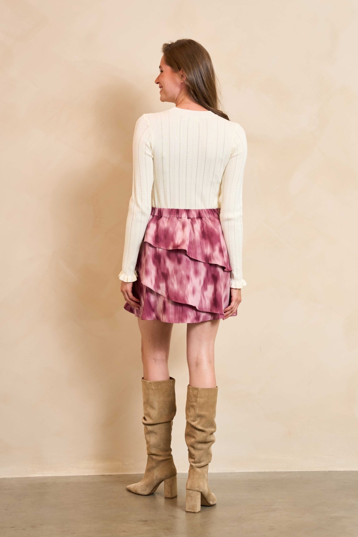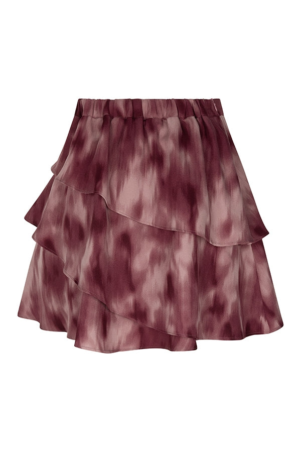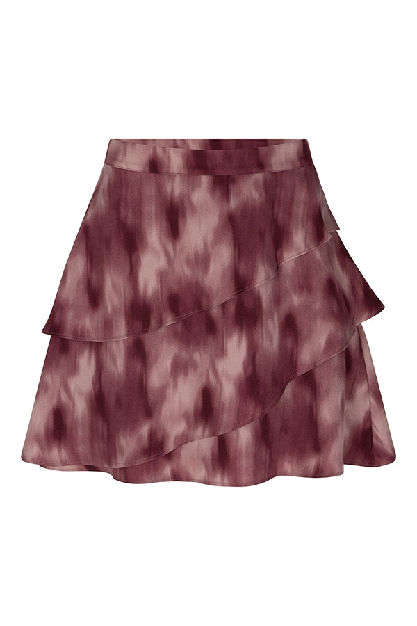 The Ayra skirt is a mauve ombre printed skirt with a relaxed fit. The ruffle details add movement, while the elasticated waistband at the back ensures a comfortable fit.