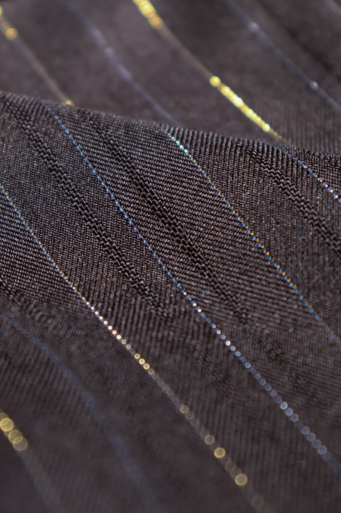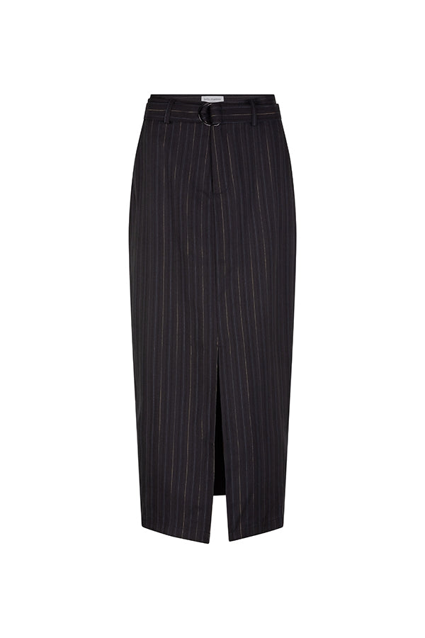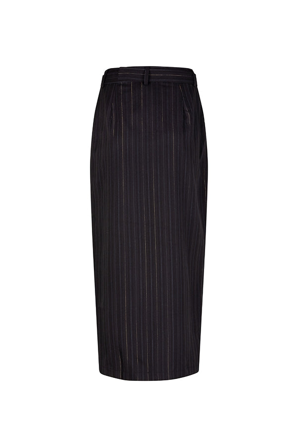 The Emily skirt is a black pencil skirt with shimmering pinstripes thanks to the lurex details. This black midi skirt features a front slit, a removable belt at the waist, and a hook-and-eye closure. The striped skirt has a straight fit.