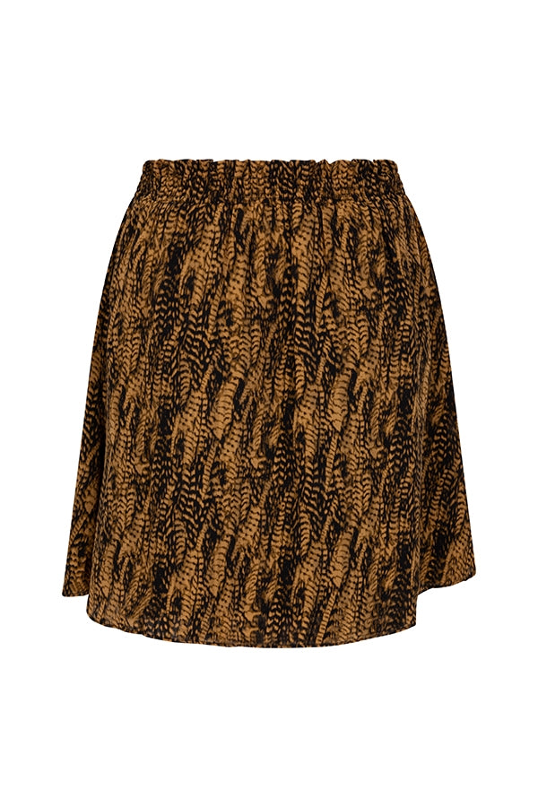 The Katalin skirt is a colorful, short, printed skirt. It features a slanted ruffle panel, an elasticated waistband, and is made of a beautiful chiffon fabric. This colorful skirt has an A-line fit.