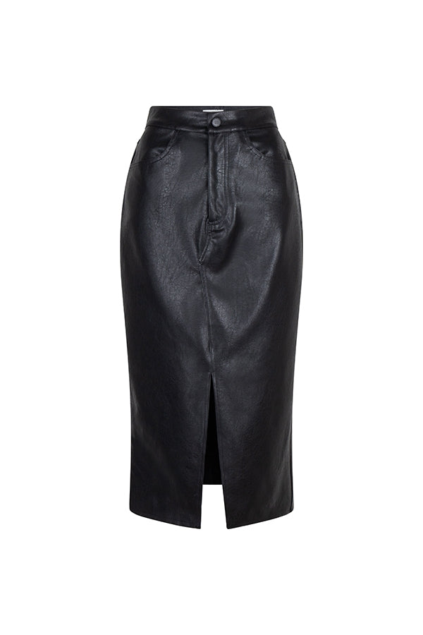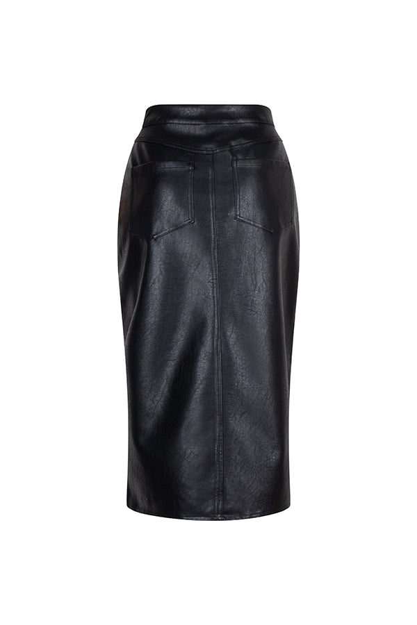 Skirt Puck is a stylish midi pencil skirt with a fitted. The skirt is made of vegan leather and has a button and zip closure, belt loops and practical pockets on both the front and back. There is a subtle split in the middle at the front.