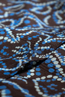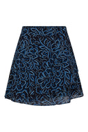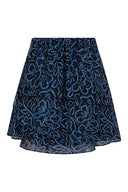 The Zahra skirt is a colorful skirt with multiple diagonal flounces. It's high-waisted, has an elasticated waistband, and a concealed side zipper.