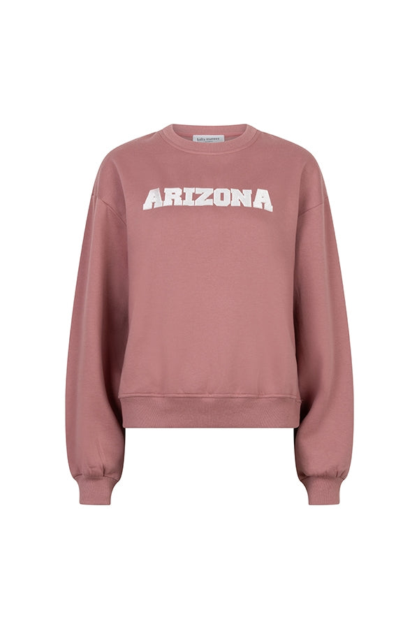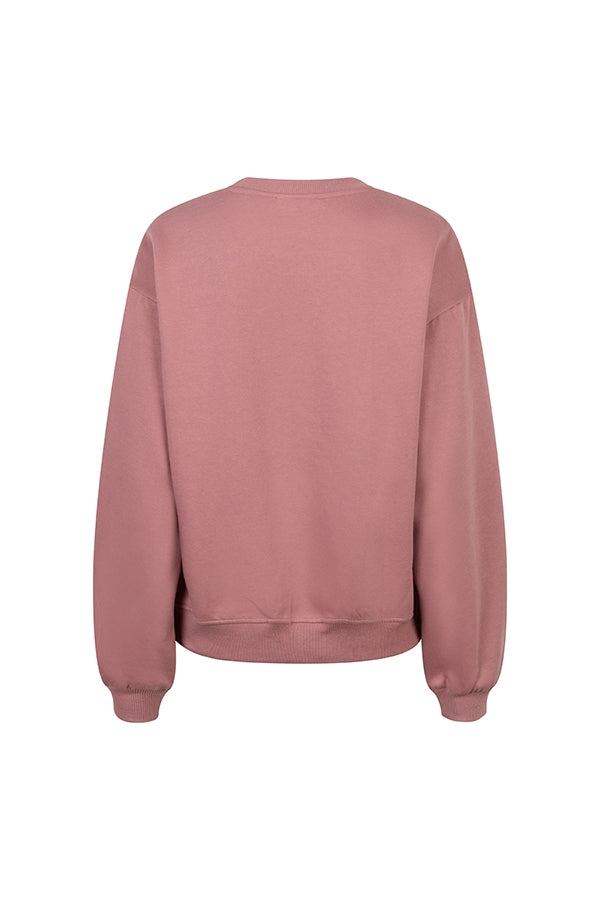The Nayla sweater is a mauve-pink sweater with a crew neck and long sleeves. The artwork on the chest adds a statement, while the loose fit makes it comfortable to wear.