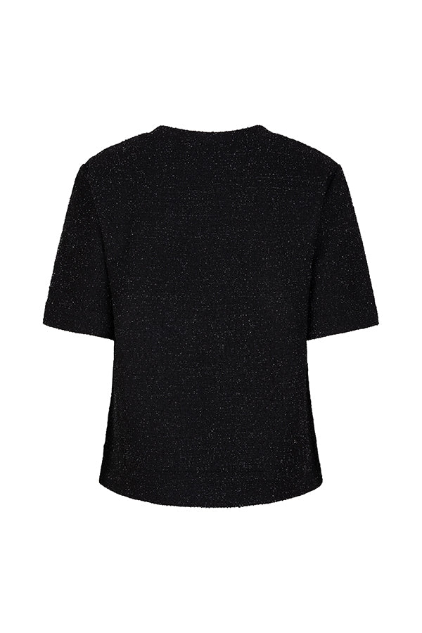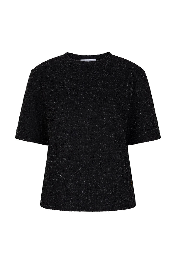 The Eva top is a black top with short sleeves and a boxy fit. It has a high round neck and is made of tweed fabric with a subtle shimmer thanks to the lurex details. The top has a loose fit.