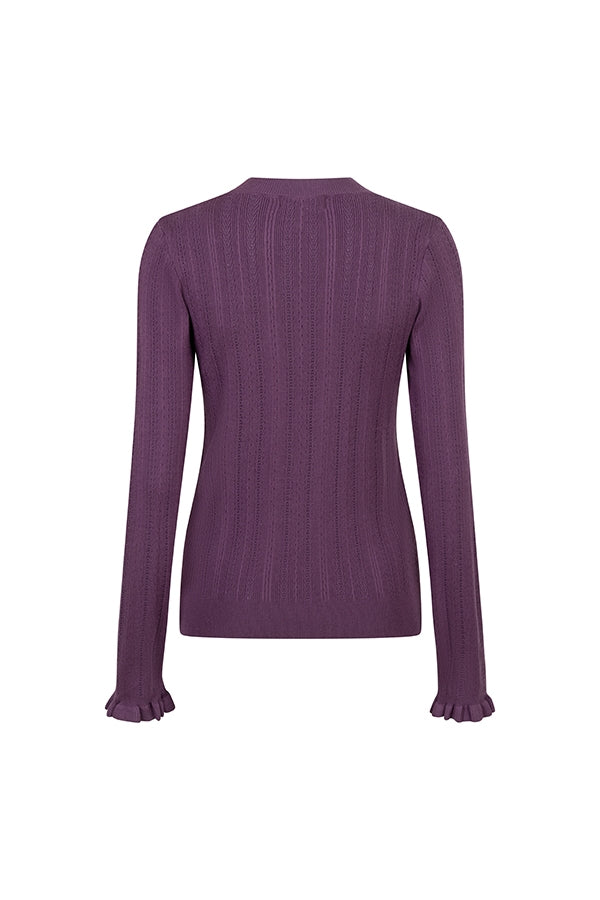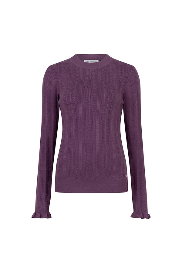 Top Lavi is a purple top with a round neck and long sleeves. The ruffle detail at the cuffs adds a feminine touch.