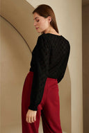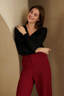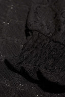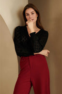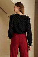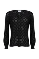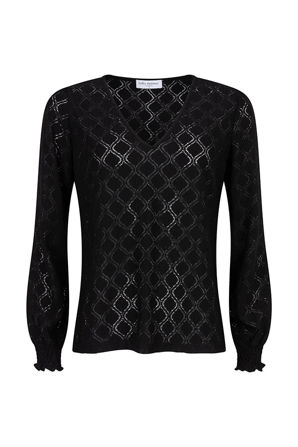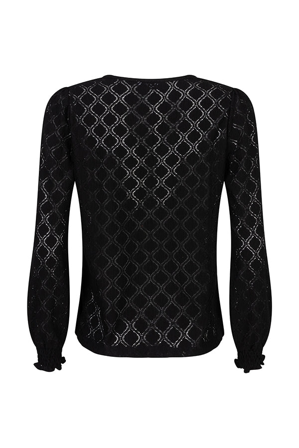 Top Sarahi is a black top with V-neck and puff sleeves with smock sleeve ends. This loose-fitting top is made of slightly openwork fabric and contains a lot of stretch.