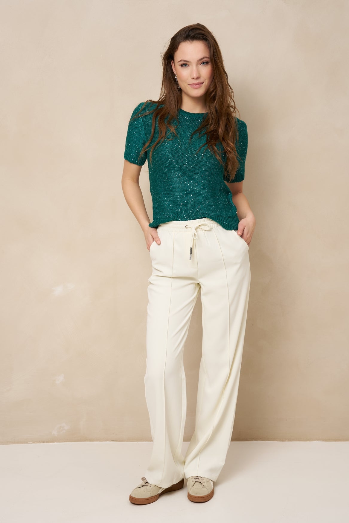 The Tilia top is a teal top with a round neck and short sleeves. The fabric has a subtle sheen thanks to the sequin detail and feels soft against the skin. The top drapes loosely and is comfortable to wear. A great choice for both casual looks and a night out.