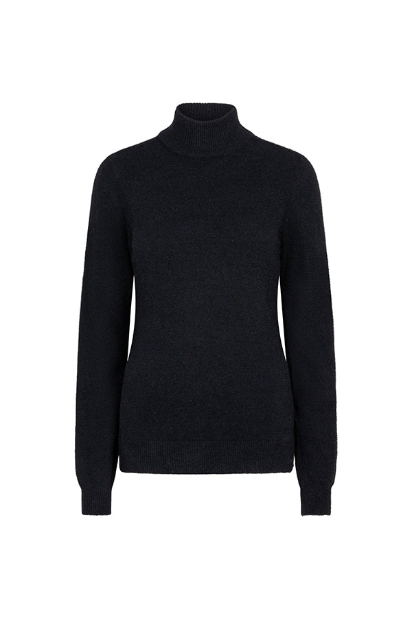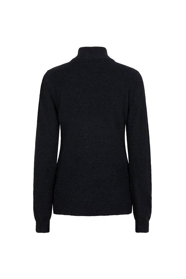 Sweater Maya is a knitted sweater made of a soft fabric. The black sweater has a high collar and is fitted.