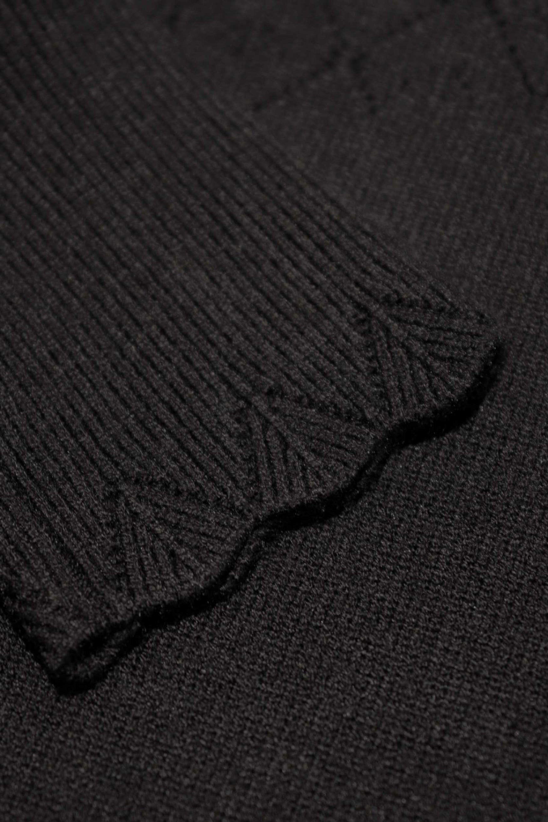 Trui Romy is een zwarte trui met ribbelpatroon bij de hals en een subtiel opengewerkt knitwear patroon bij de borst en mouwen. Qua fit is de trui aansluitend.