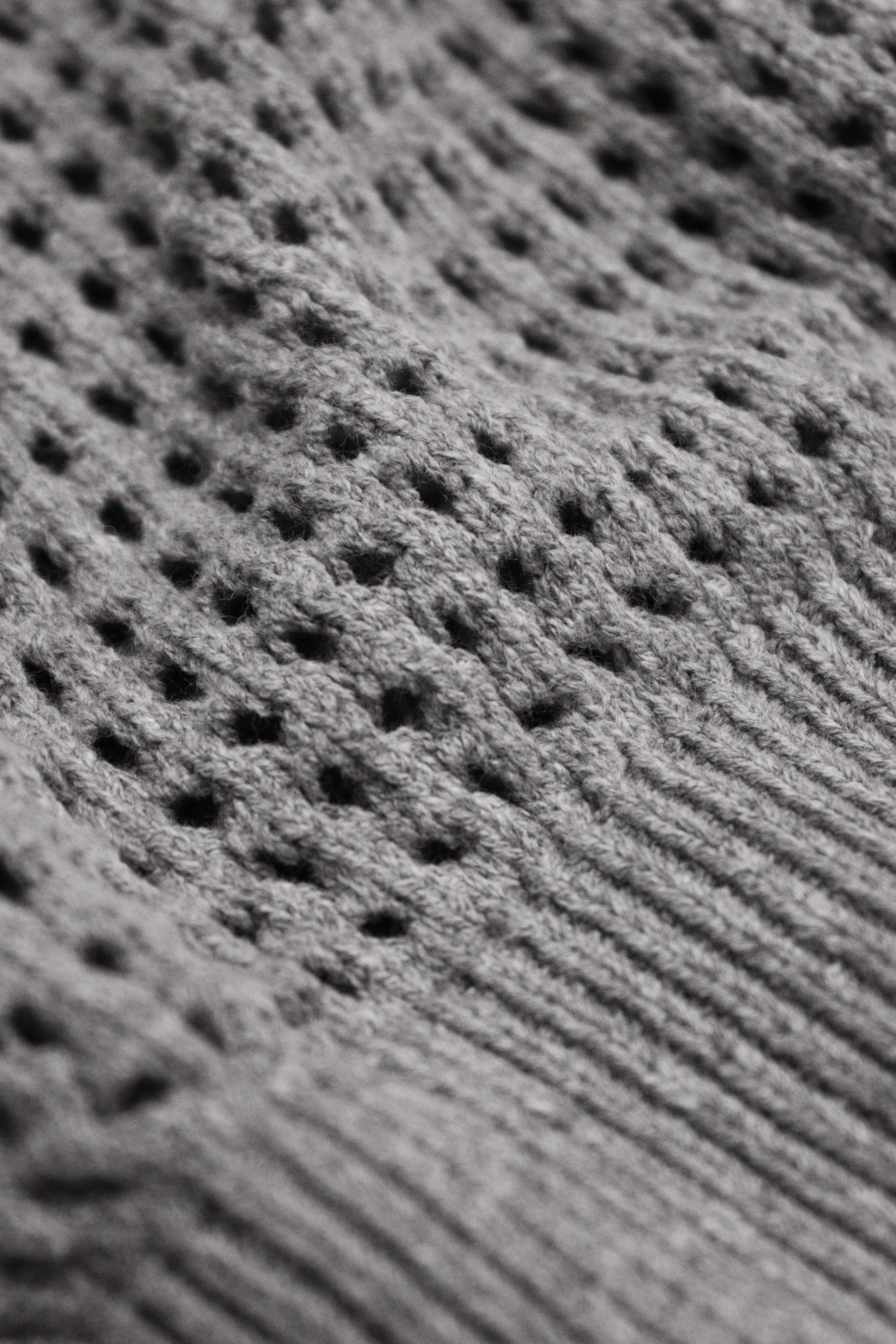 Sweater Sia is a loose-fitting gray sweater with a round neck and an openwork fabric that provides a subtle see-through effect.