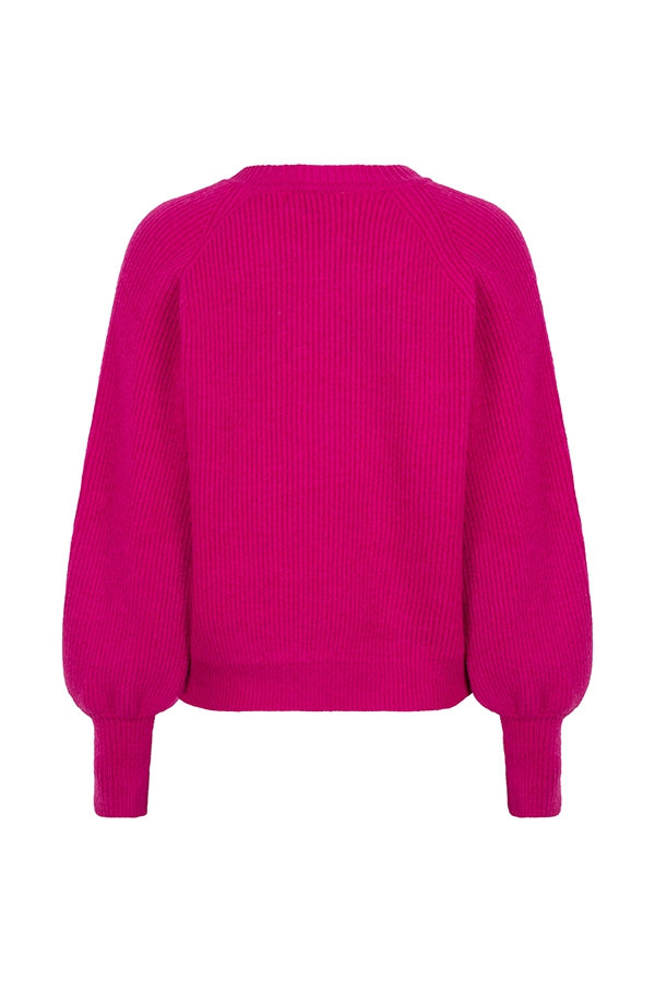 Vest Aria is een roze gebreid vest met knoopjes over de gehele lengte. Het vest heeft een ronde hals, subtiele pofmouw en de mouwuiteinden zijn aangesloten.