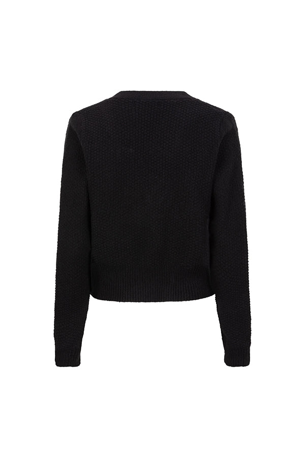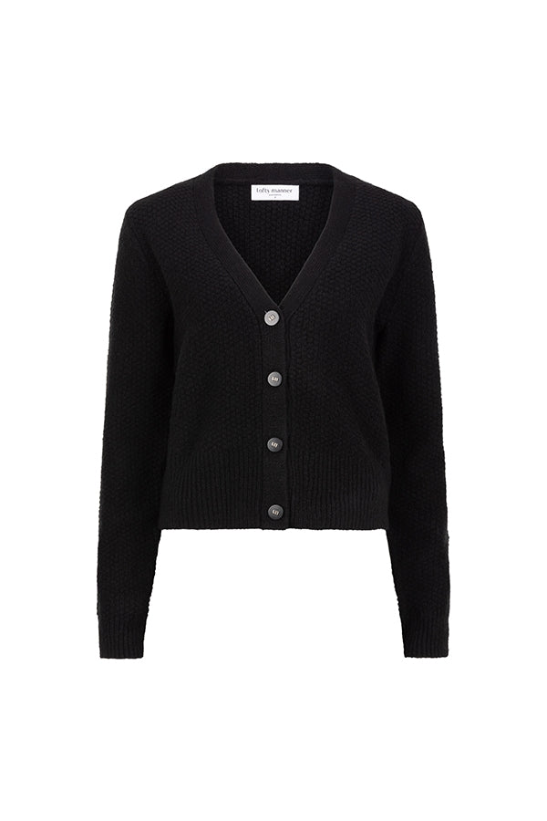 The Jada cardigan is a black cardigan with a V-neck. This knitted cardigan has four silver buttons and is fitted at the cuffs. The black cardigan is very stretchy and has an oversized fit.