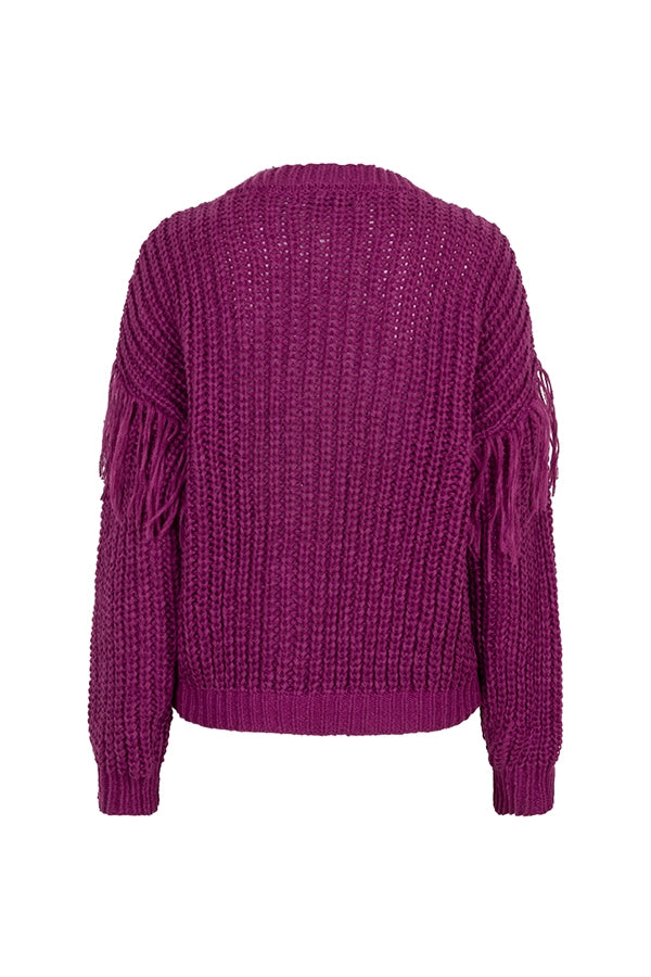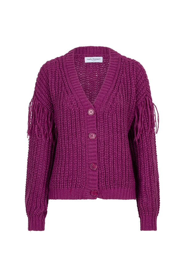 Vest Jade is a purple knitted vest with a V-neck and buttons from top to bottom. The vest is loose-fitting and has fringes on the sleeves. The sleeve ends are fitted.