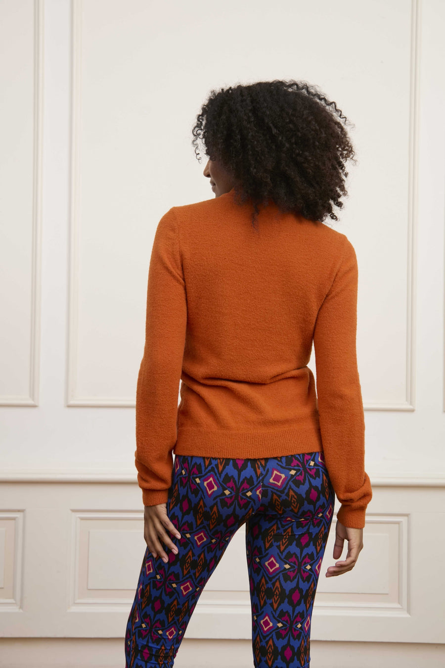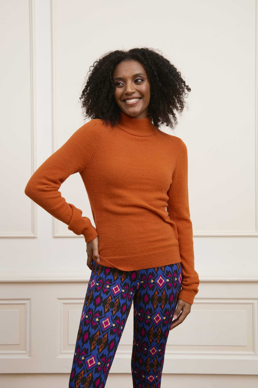 Le pull Maya est un pull tricoté confectionné dans un tissu doux. Le pull de couleur orange a un col haut et une coupe ajustée.