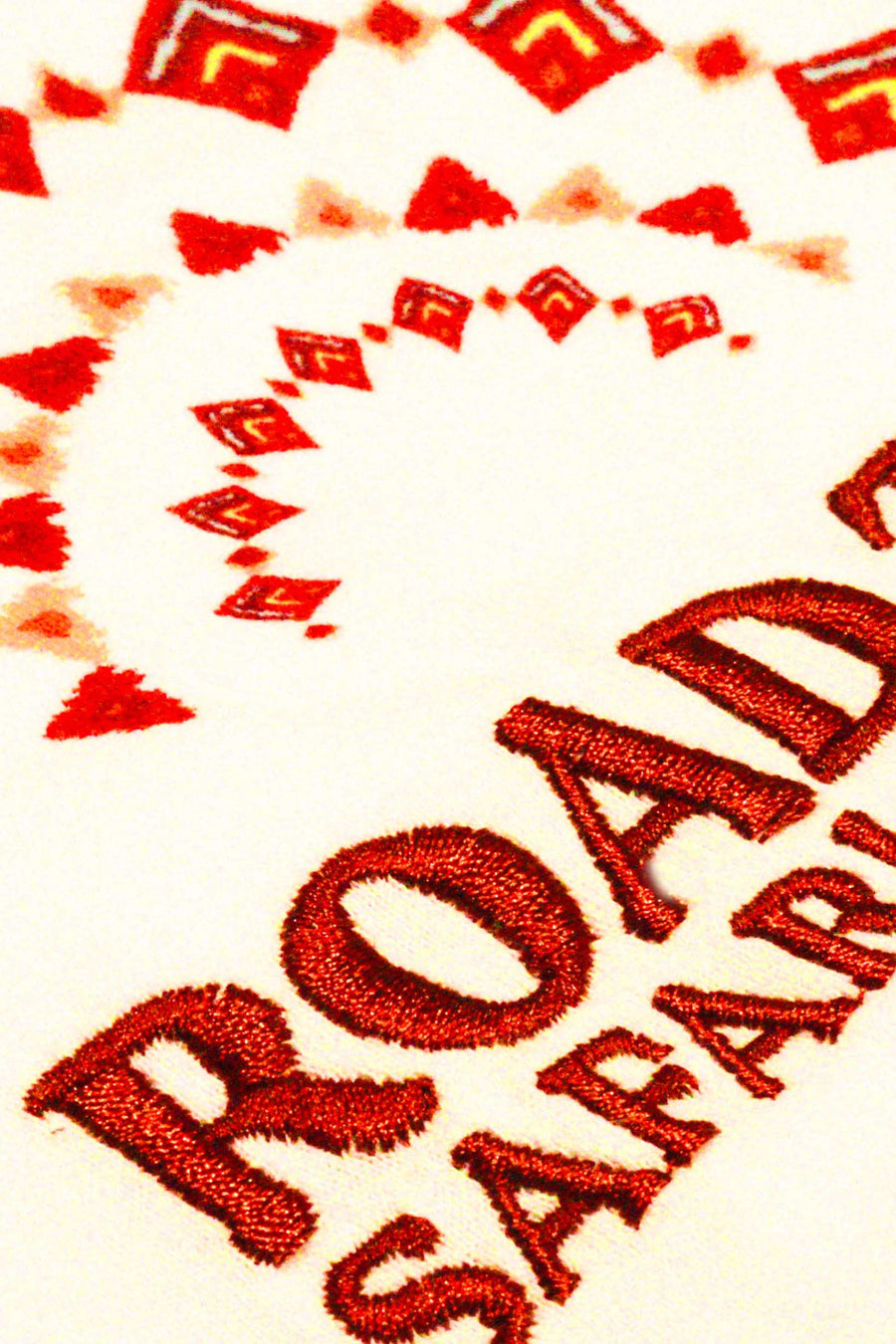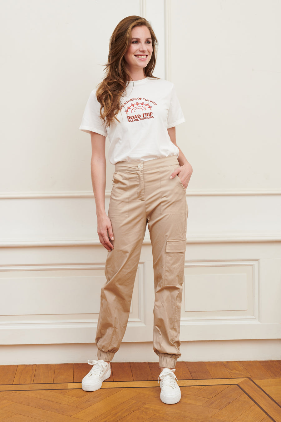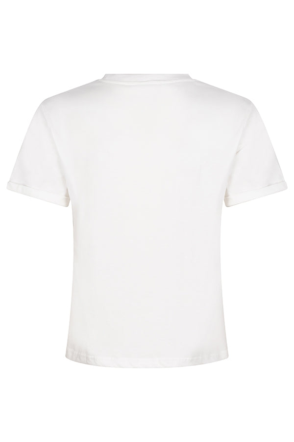 Le T-shirt Estelly a un col rond haut et un motif artistique sur la poitrine. La chemise blanche a des manches retroussées et une coupe ample.
