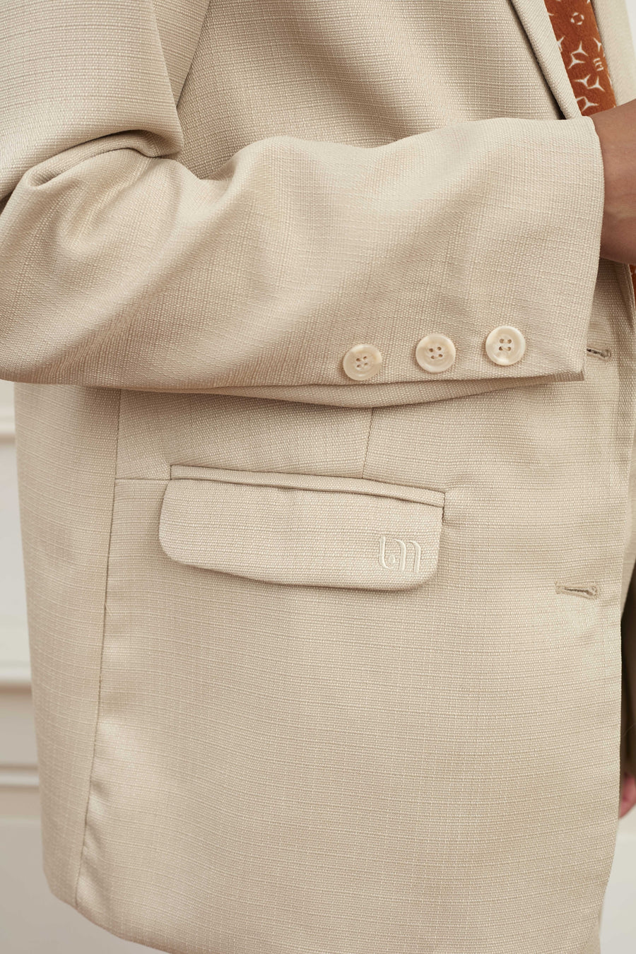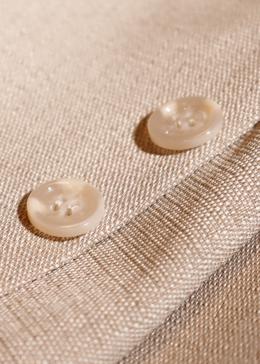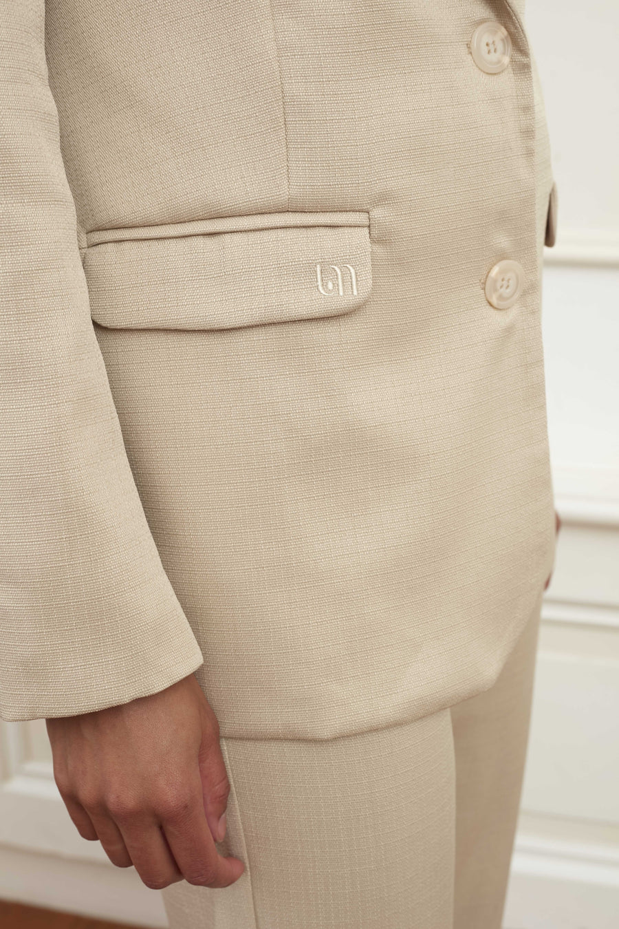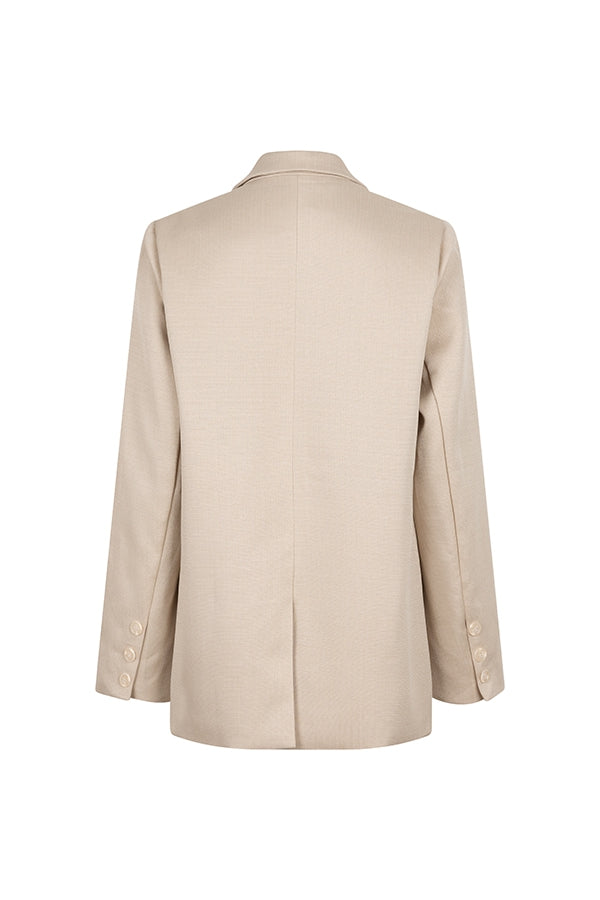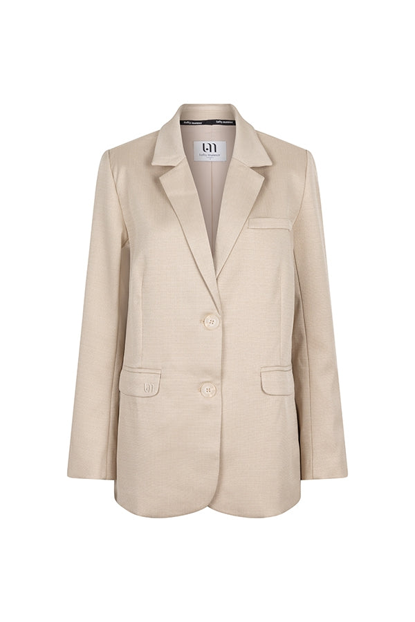 Le blazer Nadia est un blazer beige avec deux boutons, une poche décorative sur la poitrine et deux poches latérales avec monogramme. Le blazer aspect lin a une coupe droite et peut être porté en costume avec un pantalon Deidra.