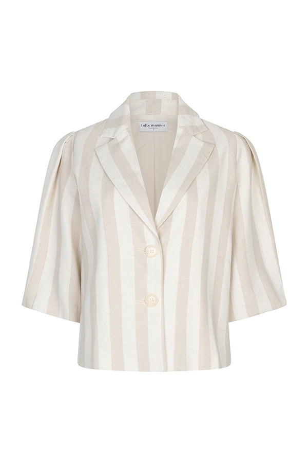 Le blazer Oriana est un blazer court beige qui peut aussi se porter comme un top. Ses manches courtes bouffantes, élastiquées et à rayures effet lin, lui confèrent une touche de fraîcheur. Il se marie parfaitement avec un short ou une jupe assortie pour une tenue complète.