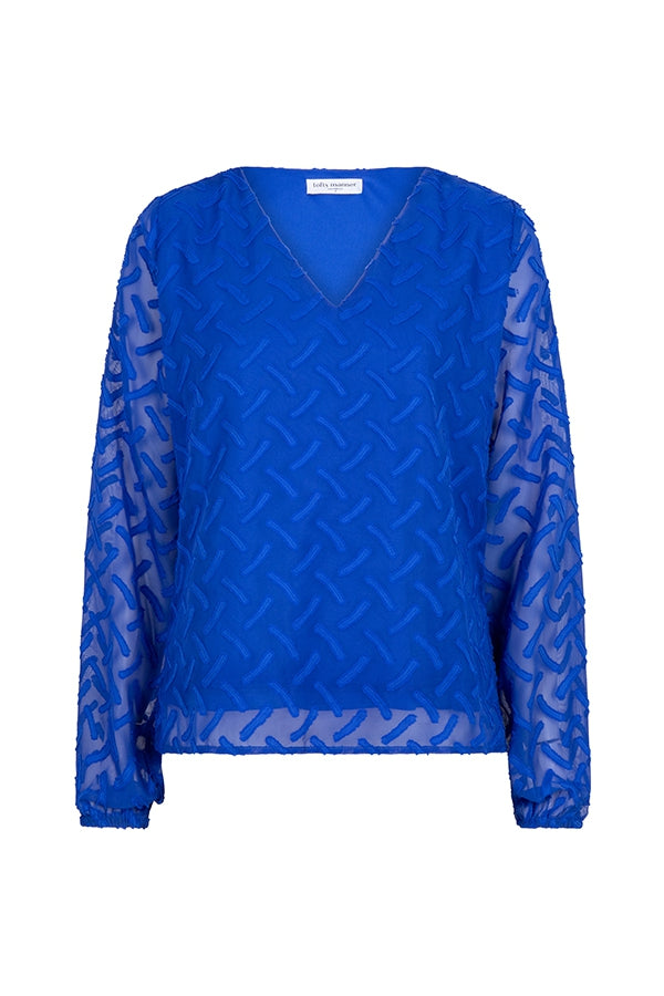 La blouse Gigi est une blouse droite bleue dotée d'un col en V et d'élégantes manches bouffantes. Les extrémités des manches sont finies avec un élastique et le chemisier présente un motif dans le tissu.