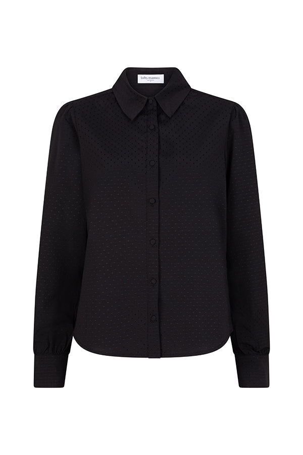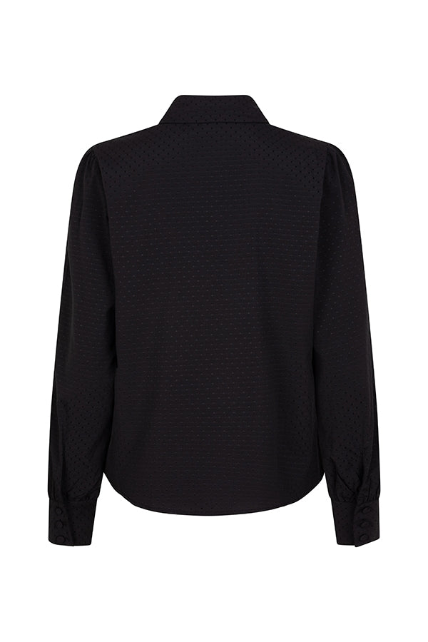 La blouse Lia est une blouse noire classique. Elle présente un col classique, des boutons sur toute la longueur et des détails sur la poitrine. Sa coupe est droite.