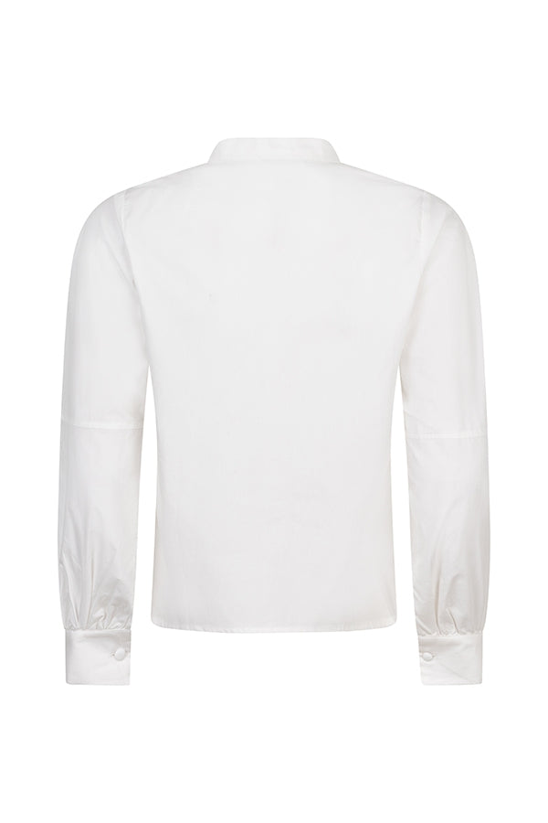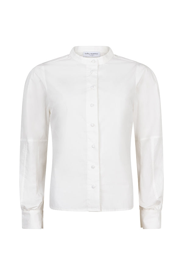 Blouse Loena est une blouse en coton blanc avec un col classique et des boutons de haut en bas. Les extrémités des manches ont des poignets plus hauts avec deux boutons.