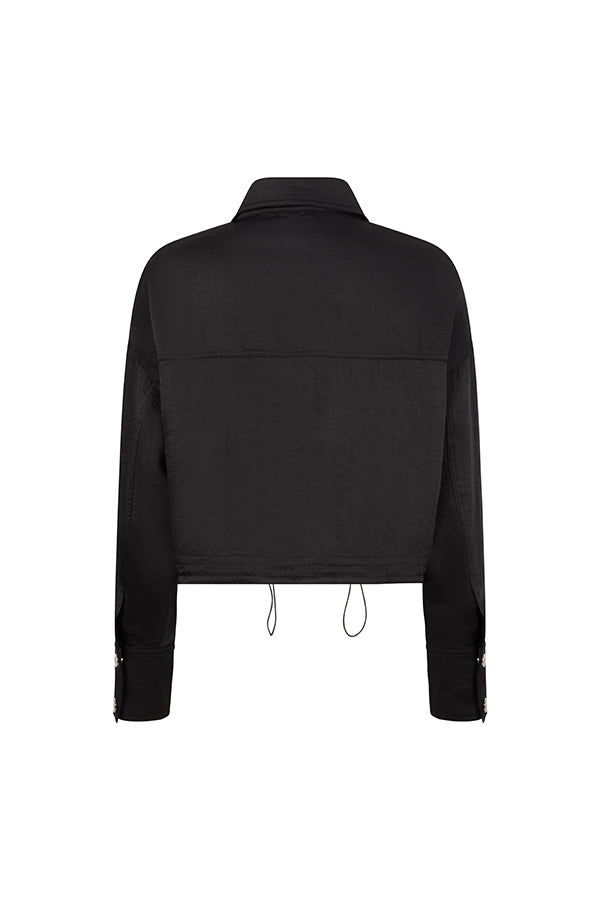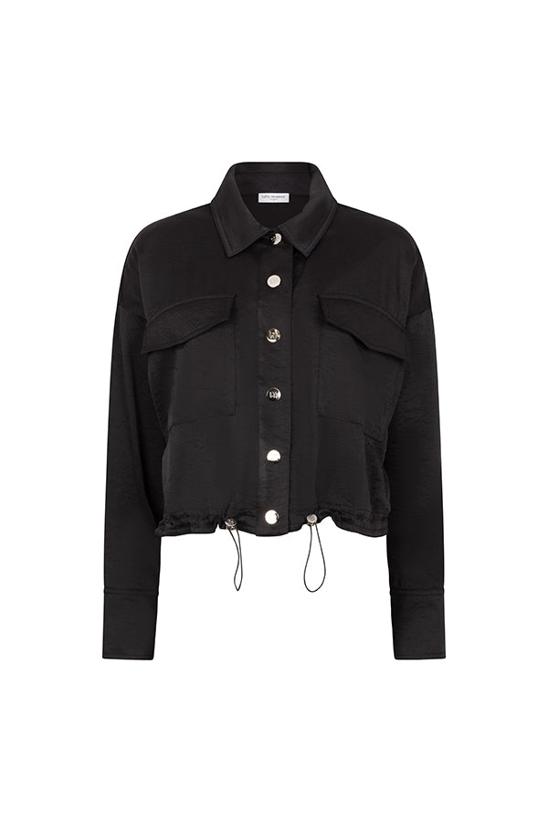 La blouse Tilde est une blouse noire en tissu satiné. Elle est dotée de poches poitrine, de boutons sur toute la longueur et d'une taille élastique avec cordons de serrage. Sa coupe est droite.